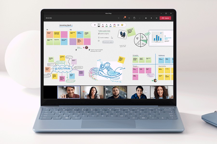More collaborative meeting tools include Presenter Mode, meeting recording and transcription, digital whiteboards, and interactive backgrounds such as Together Mode.