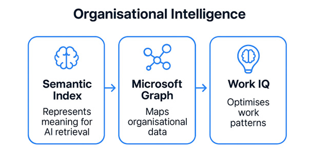 These components operate together. Semantic Indexes power AI reasoning. Microsoft Graph ensures secure, contextual access. Work IQ drives behavioural improvement and AI readiness.