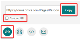 To share your form via a link, select the Link button and then select Copy next to the URL field. You can also improve the appearance of the form link by checking the Shorten URL box. You can copy and paste the link wherever you need to share with others. Participants can simply click on the link to open the form and start submitting their responses.