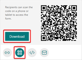 To share via a QR Code, select the QR Code button then select the Download button. You can now download your QR code as a .png file. Next, you can insert this file wherever you need so participants can scan it with a QR code scanner, such as a mobile device, to access and complete the form.