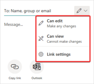 3. Select the down arrow to chose permissions for the link you want to share. Options include Can edit, Can view and Link settings. If you would like to further edit the file permissions, select Link settings.